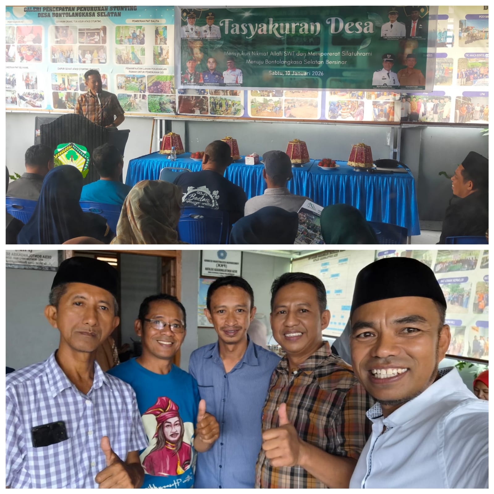 Bontolangkasa Selatan, Gowa - Masyarakat Desa Bontolangkasa Selatan, Kecamatan Bontonompo, Kabupaten Gowa menggelar Tasyakuran Desa pada tanggal 10 Januari 2026. Acara yang berlangsung di Aula Kantor Desa ini merupakan wujud syukur atas berkah dan rahmat yang telah dilimpahkan Allah Swt. kepada desa sepanjang tahun.